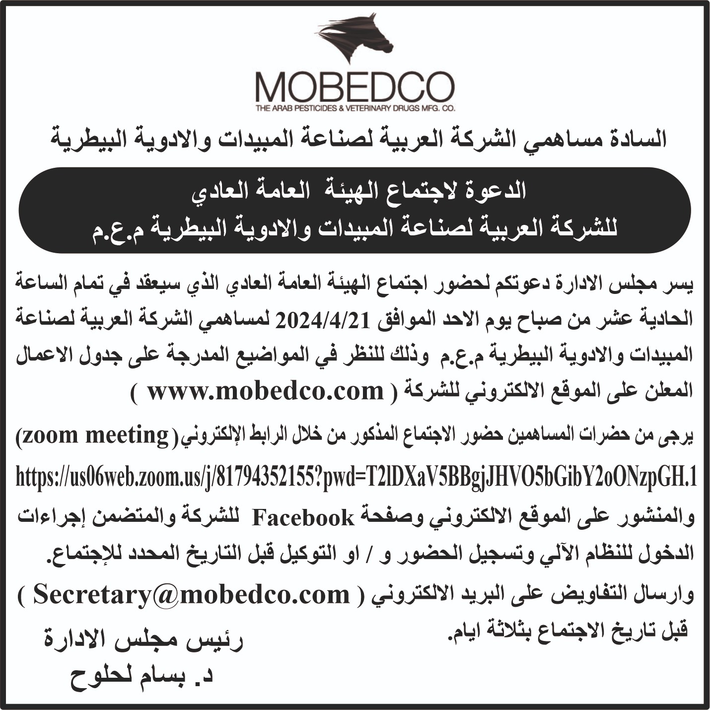 Important Announcements, Mobedco News, Newsدعوة اجتماع الهيئة العامة العادي للشركة العربية لصناعة المبيدات والأدوية البيطرية Posted by admin April 7, 2024 On April 7, 2024 0 دعوة الاجتماع الكتاب السنوي التاسع عشر قسيمة التوكيل Share: